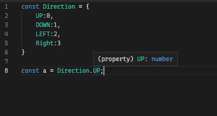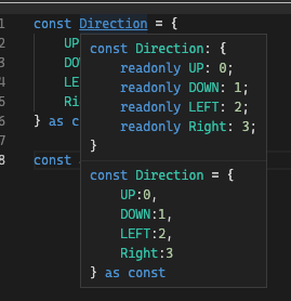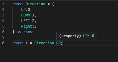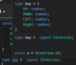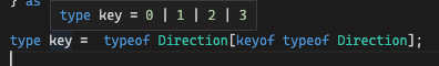 만약에 위 사진과 같이 Direction의 키 값들을 타입으로 사용하고 싶다면, keyof 를 사용한다.