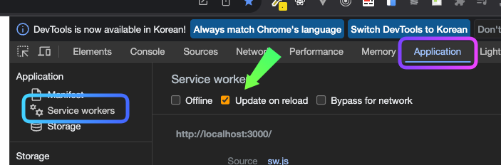 개발할 때는 Application > Service workers 에서 Update on reload 를 체크해서, 매번 새로 등록할 수 있도록 해줍니다.