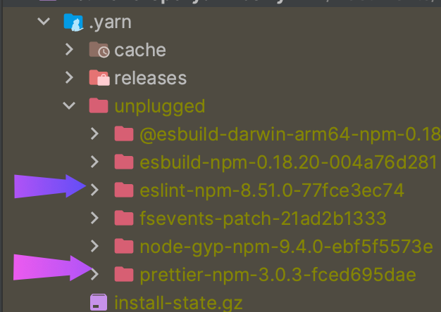 위 명령어로 eslint, prettier 를 해제하면 .yarn/unplugged/* 에 압축이 풀린 패키지가 생성됩니다.