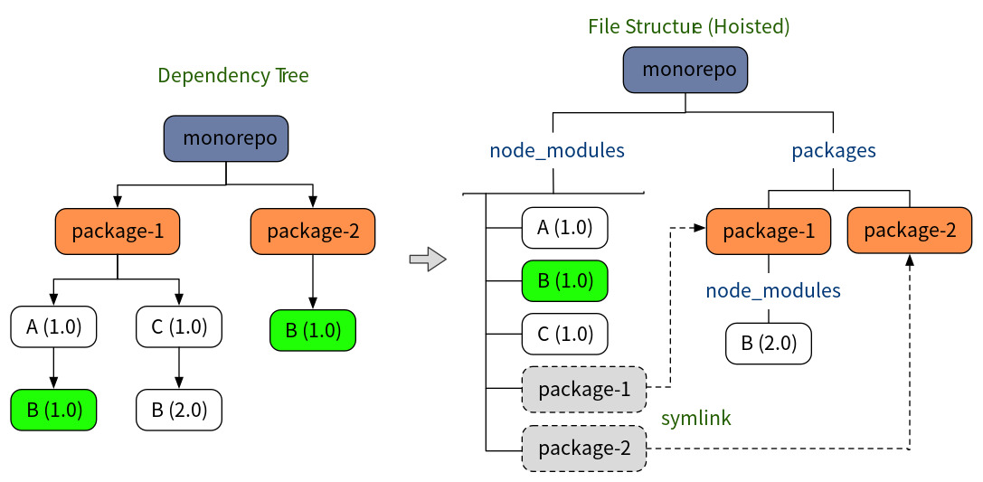 npm 과 yarn 등 모노레포를 구현한 패키지 매니저들은, 각 패키지별로 중복되는 의존성 설치를 방지하기 위해서 root 경로로 호이스팅(hoisting) 기법을 사용합니다.